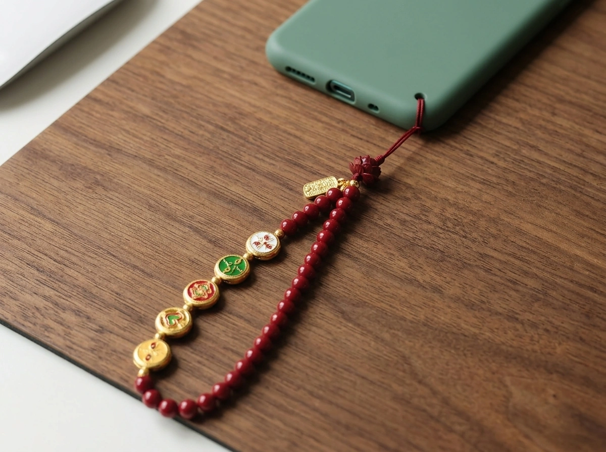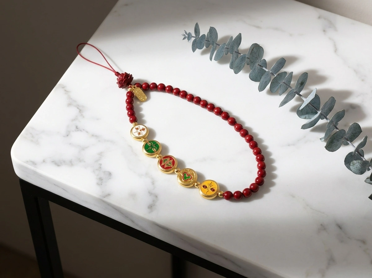 This phone lanyard is made of cinnabar – a red mineral traditionally used in Chinese culture for protection and good fortune. It features the “Five Wealth Gods”, who represent wealth coming from all five directions (east, south, west, north, and center). Carrying this charm is believed to attract financial luck and protect the wearer. It also boosts your personal energy (aura), which can bring good fortune naturally over time.