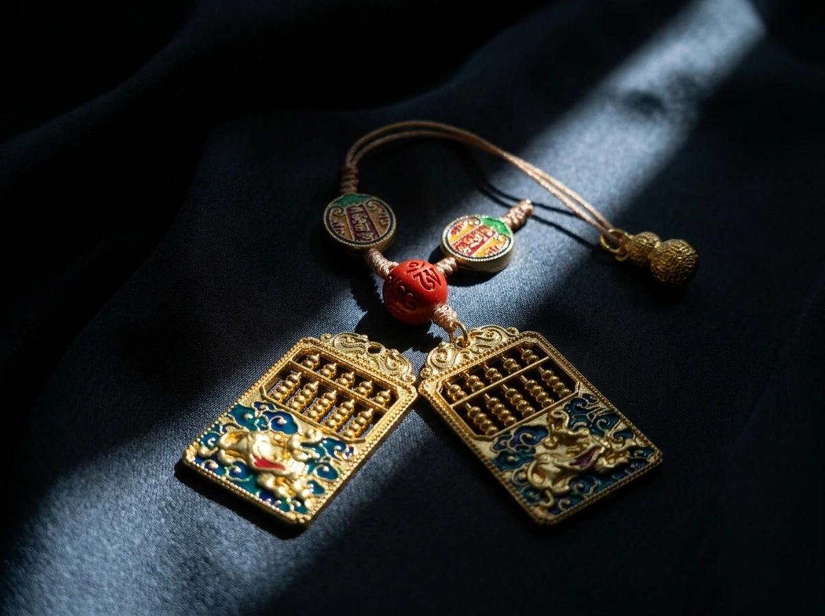 This is a tiny golden abacus. In China, people carry it to bring money luck – because an abacus helps you count your earnings, and gold means wealth. So it’s like a charm that helps your money grow.The abacus has been used for centuries by merchants and accountants. It represents the ability to count, manage, and increase money.