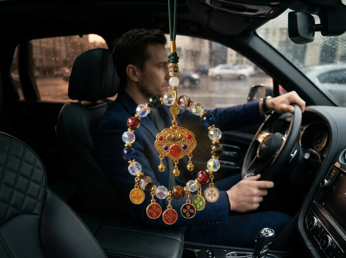 “Fortune Lock” (Fu Suo) – a traditional Chinese symbol that “locks in” good luck, health, and happiness. Made with incense ash glass (temple ash mixed into colored glass) and natural crystal. Hang in your car to secure blessings for every journey.