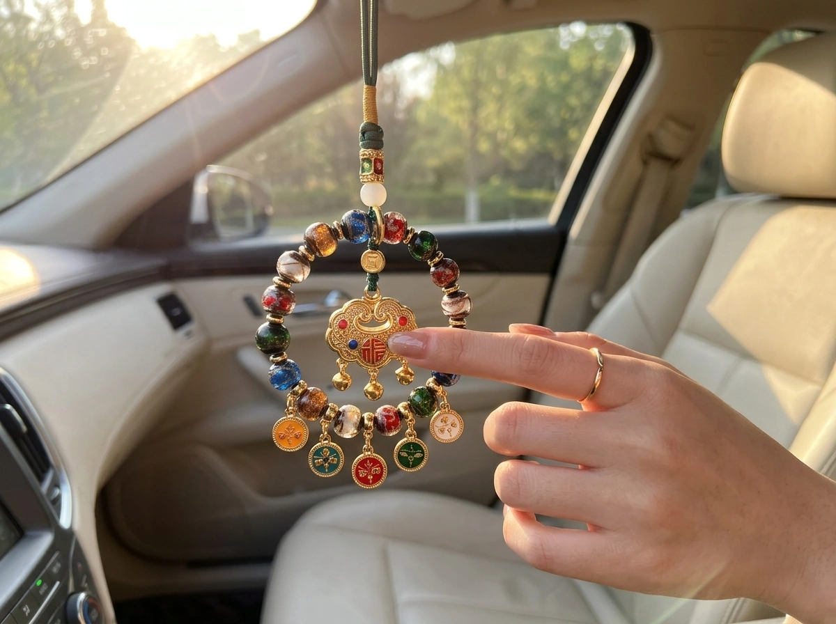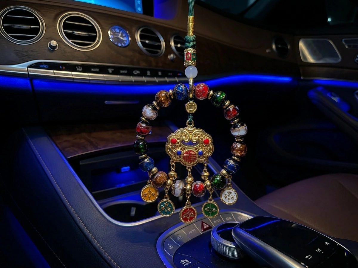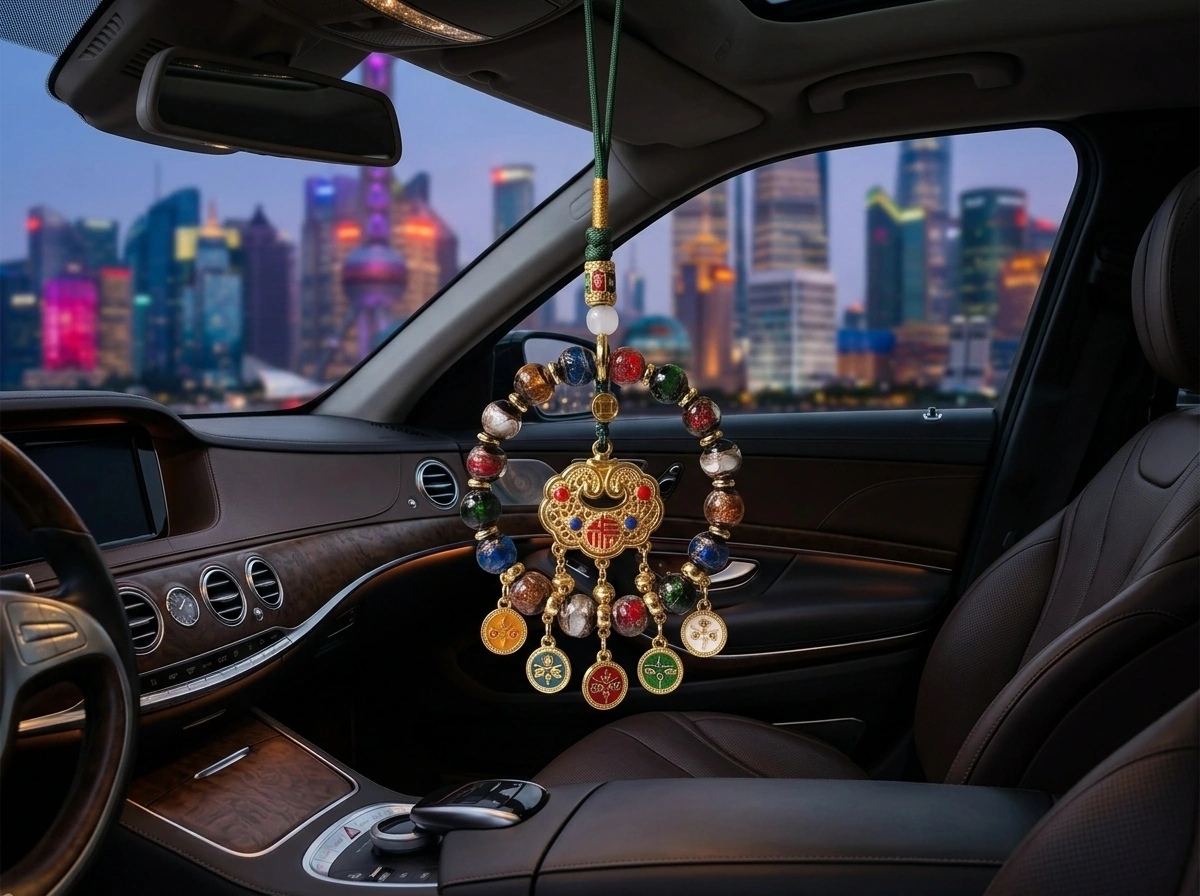 “Fortune Lock” (Fu Suo) – a traditional Chinese symbol that “locks in” good luck, health, and happiness. Made with incense ash glass (temple ash mixed into colored glass) and natural crystal. Hang in your car to secure blessings for every journey.