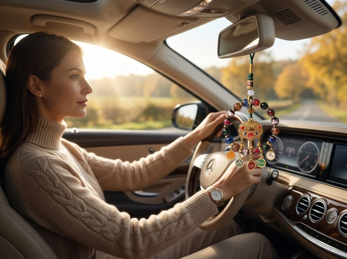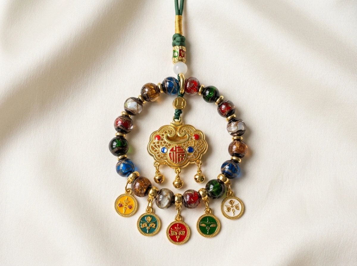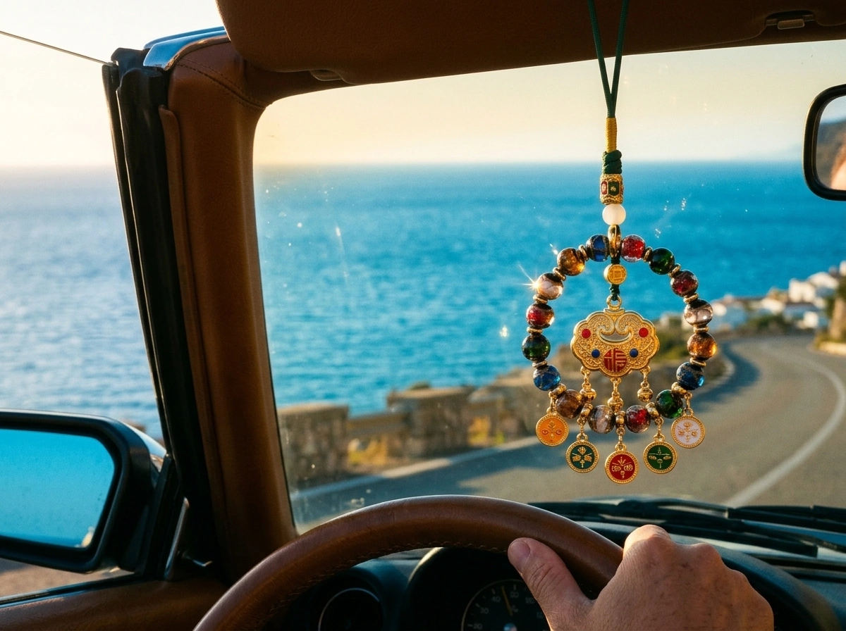 “Fortune Lock” (Fu Suo) – a traditional Chinese symbol that “locks in” good luck, health, and happiness. Made with incense ash glass (temple ash mixed into colored glass) and natural crystal. Hang in your car to secure blessings for every journey.