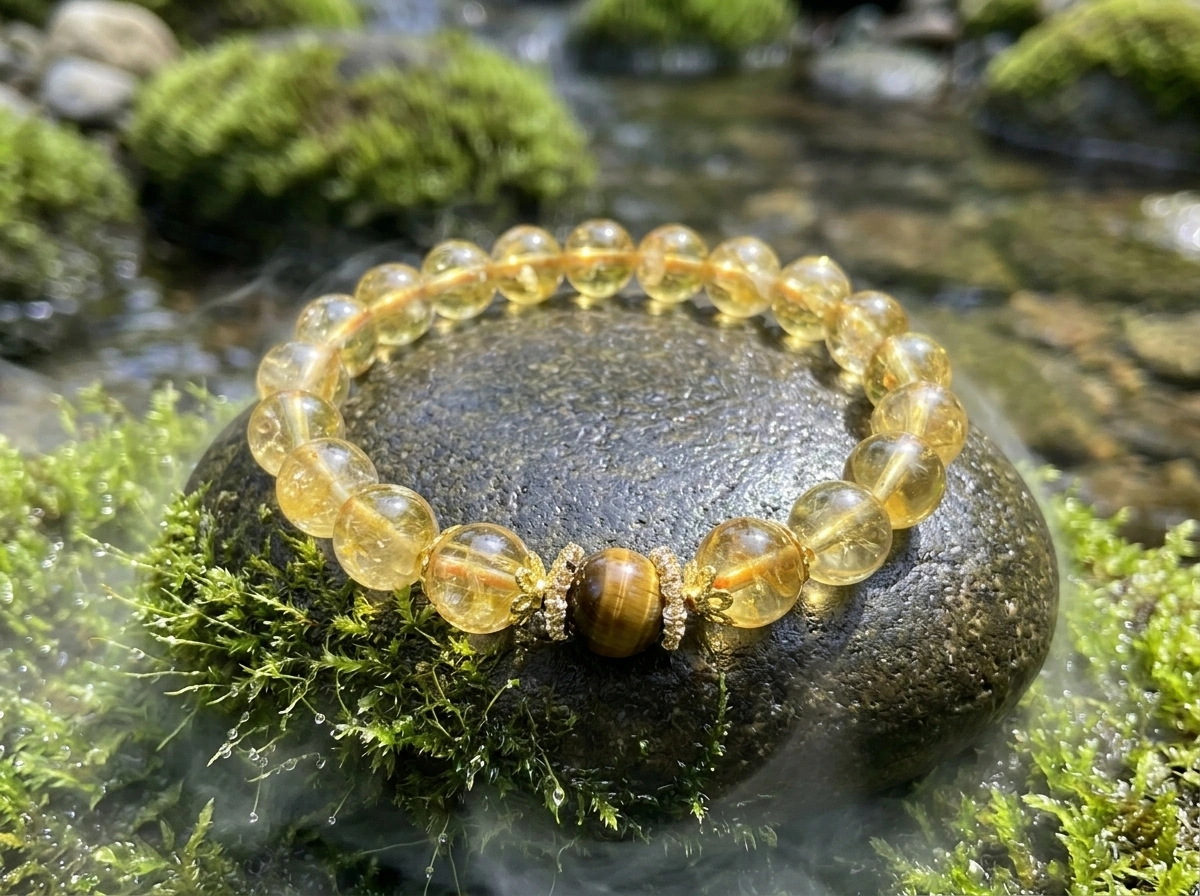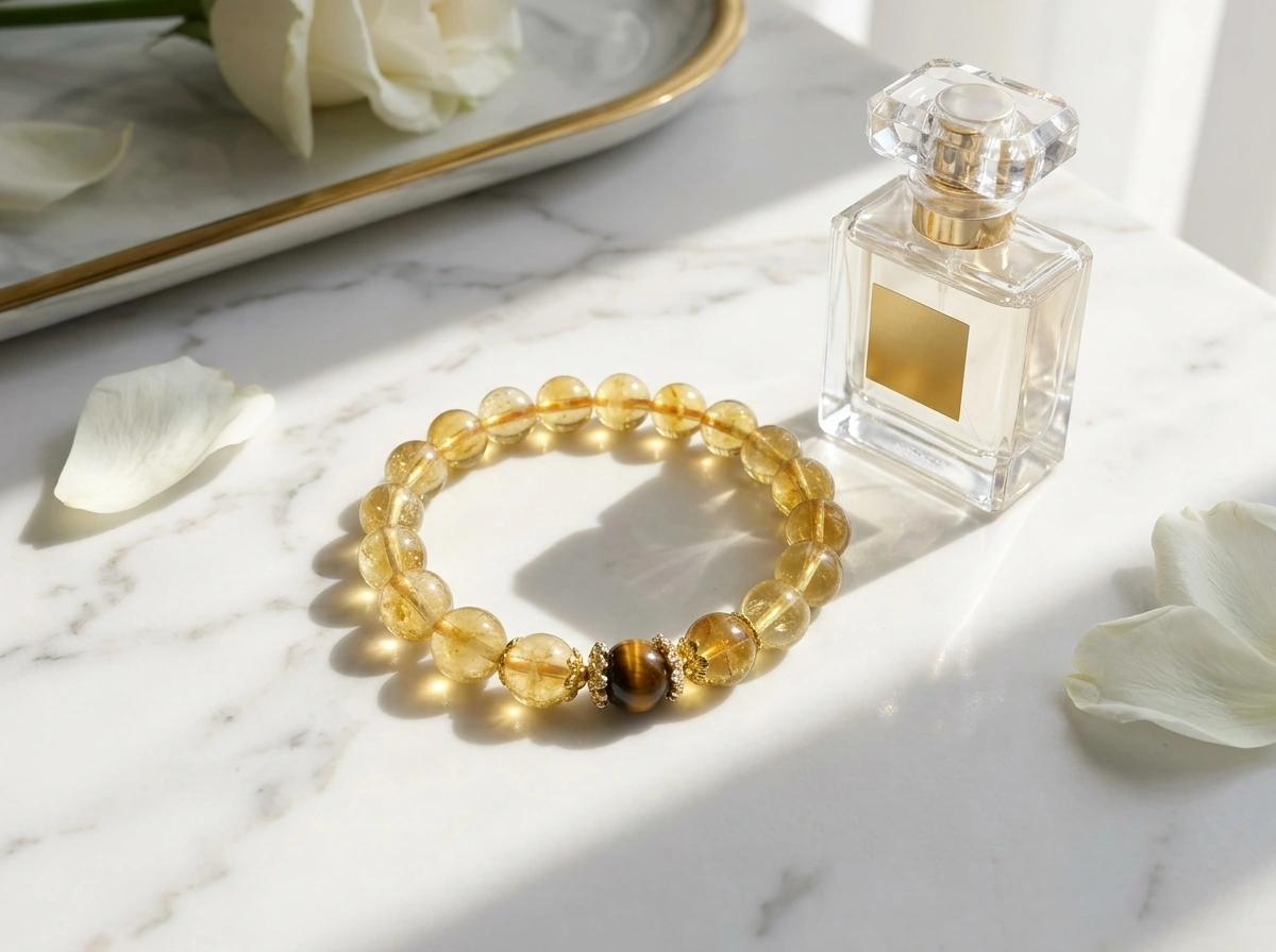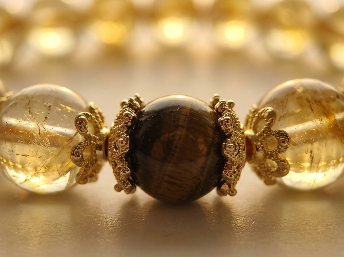 Citrine – a golden crystal for wealth, success, and optimism. Tiger’s Eye – a stone for confidence, focus, and protection. Worn together for balanced energy and good fortune.