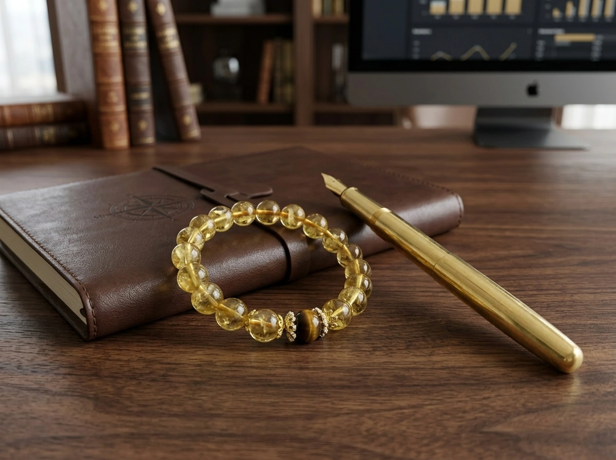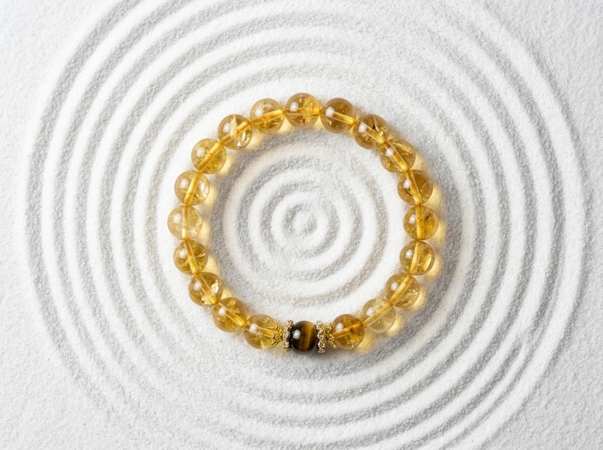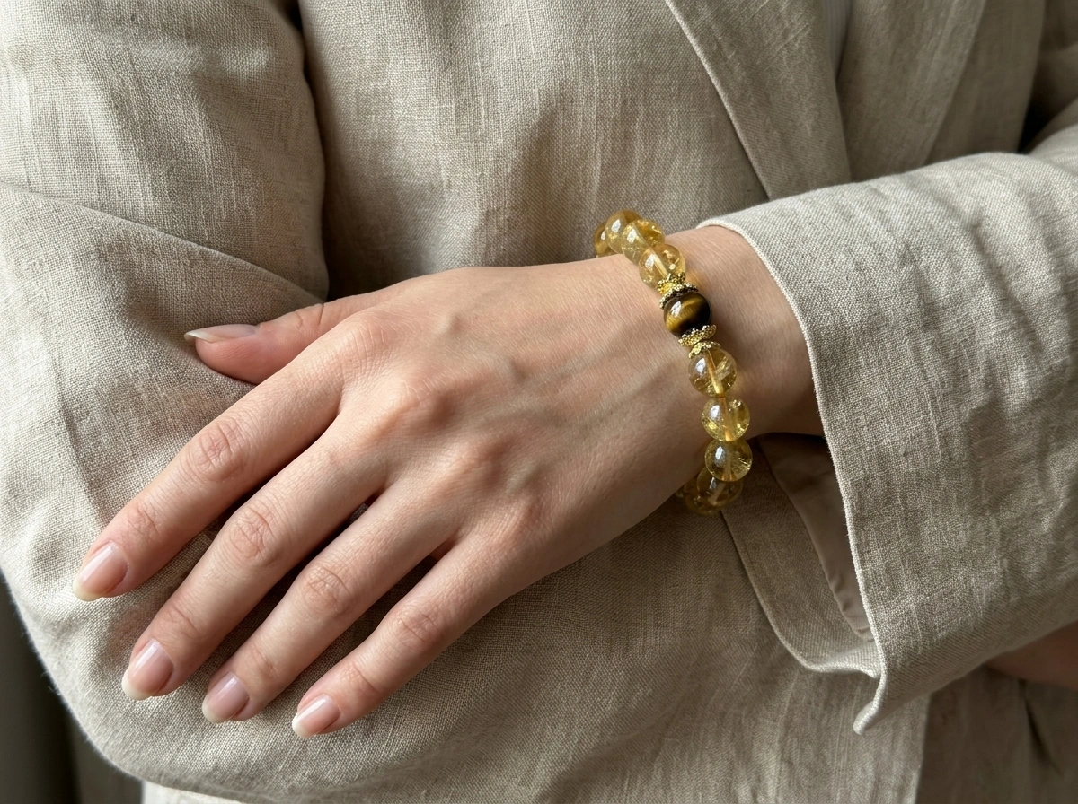 Citrine – a golden crystal for wealth, success, and optimism. Tiger’s Eye – a stone for confidence, focus, and protection. Worn together for balanced energy and good fortune.