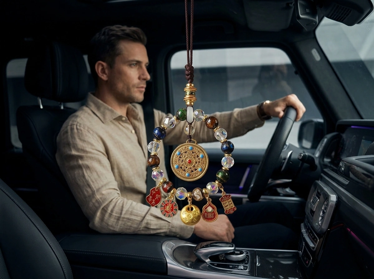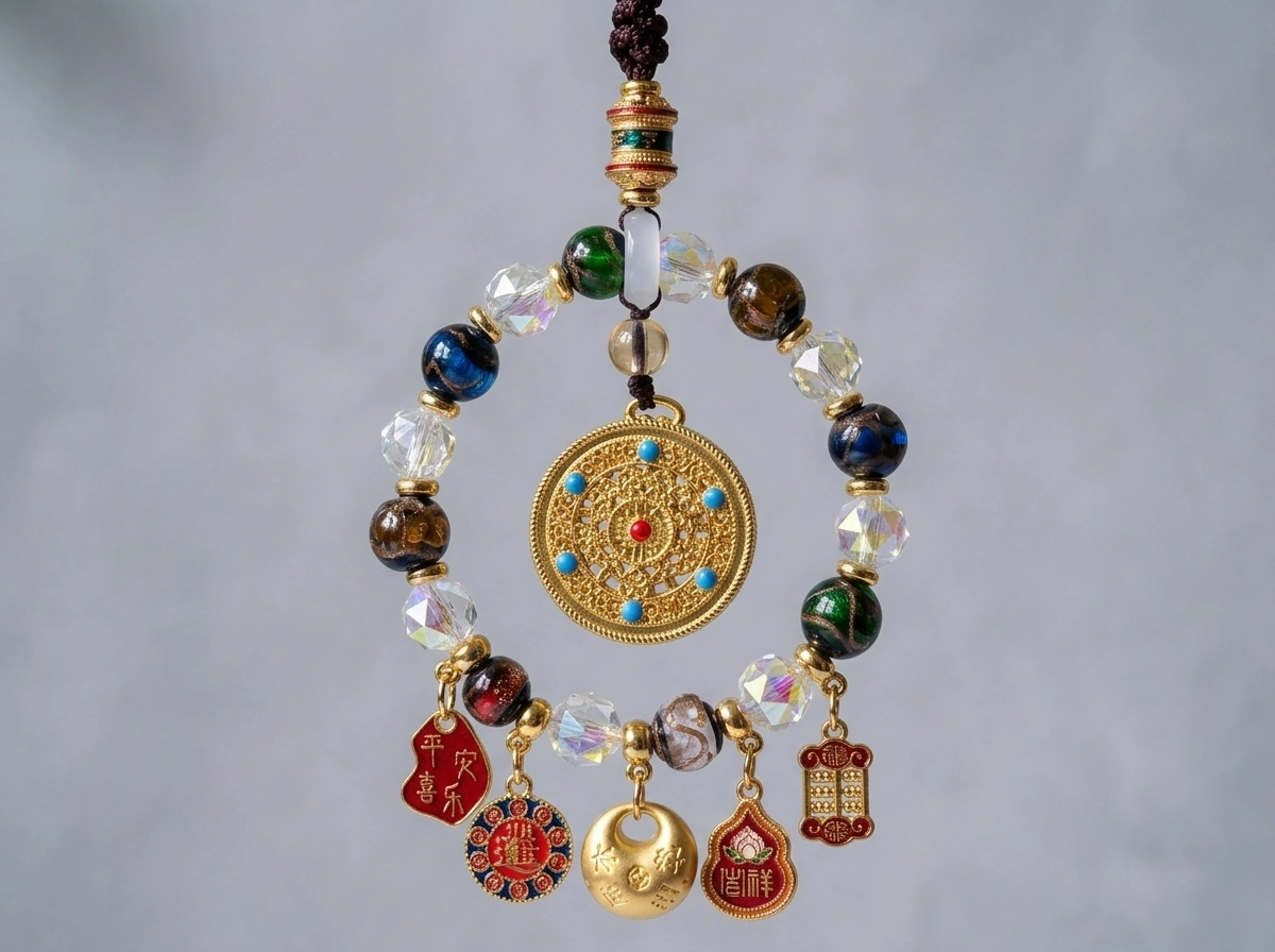 Five Blessings Complete Car Pendant – Incense Ash Glazed Glass & Crystal
