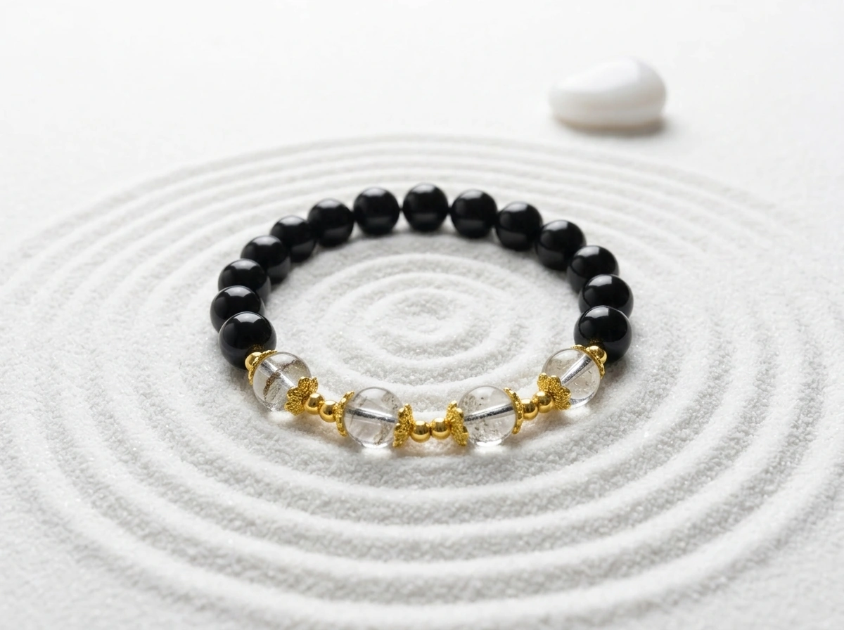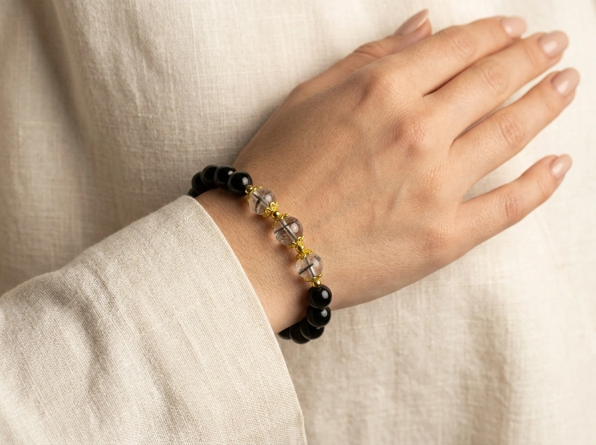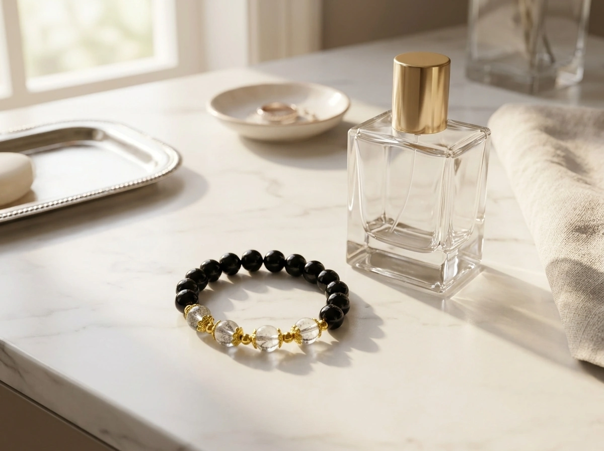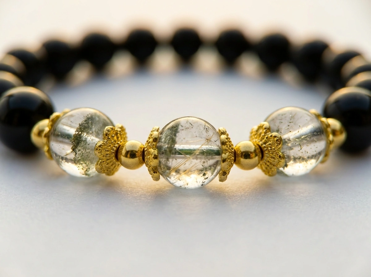 Black obsidian – a powerful volcanic glass that shields against negativity. Green phantom quartz – a crystal that attracts wealth, growth, and success. Worn together for balanced protection and prosperity.
