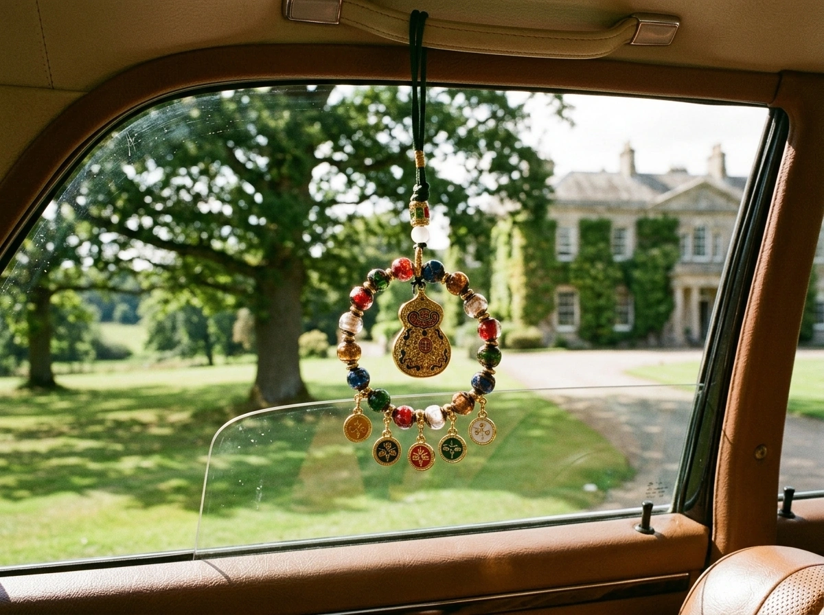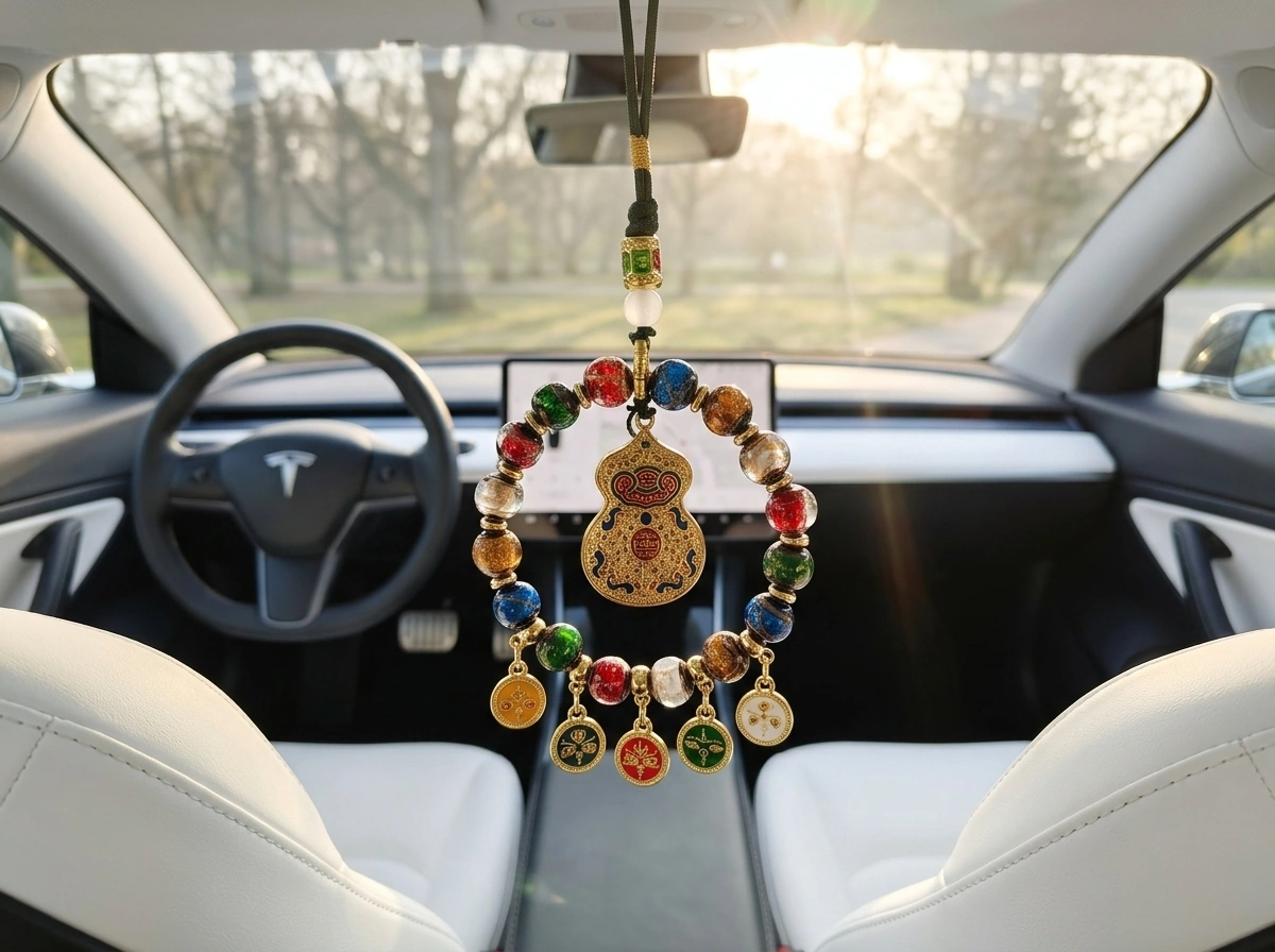 Auspicious gourd (Hulu) – traditional symbol of protection, health, and good fortune. “Filigree” is fine metal wire artistry. Made with incense ash glass (temple ash mixed into glass). Hang in your car for blessings and safe journeys.